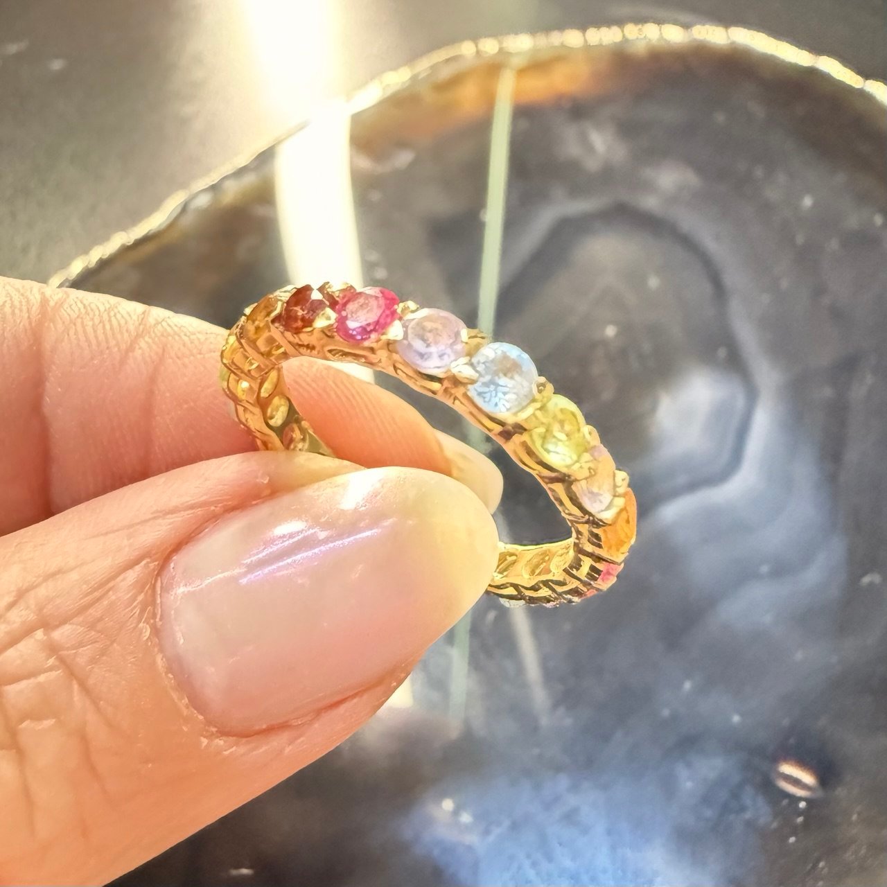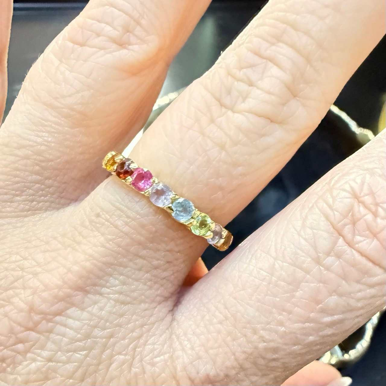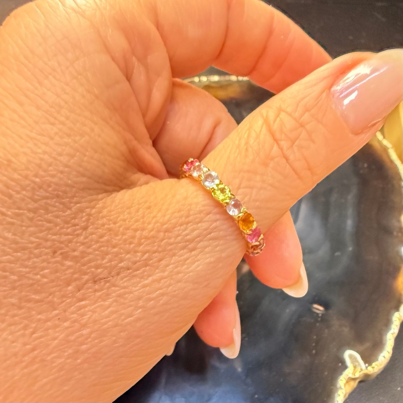 Aliança de pedras naturais coloridas (Turmalina Rosa, Topázio, Peridoto, Citrino, Granada e Ametista), no ouro amarelo 18K