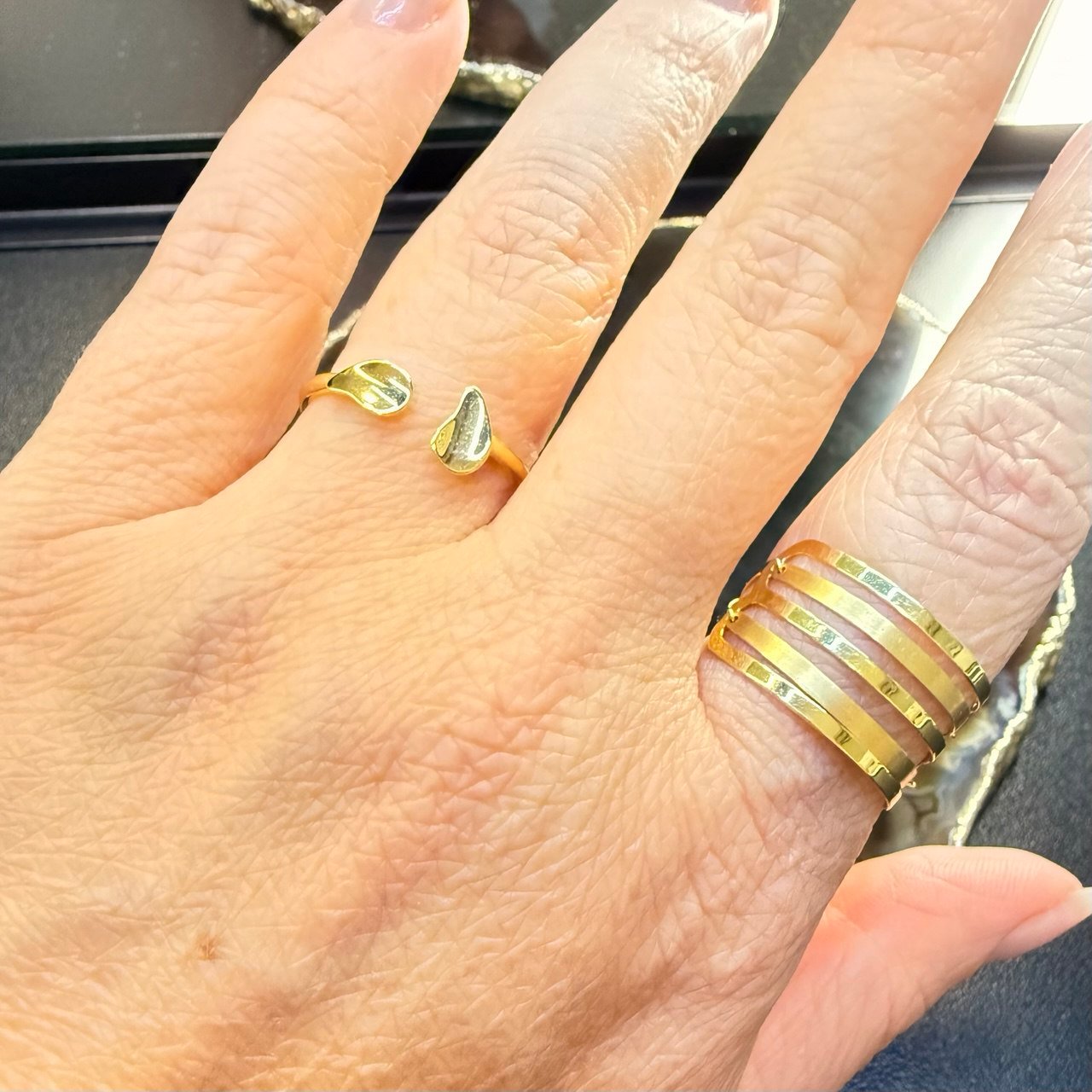 Anel 2 Folhas côncavas, aberto, podendo ser delicadamente ajustado um ponto a mais ou um ponto a menos, aproximadamente 1,2gr, no ouro amarelo 18k