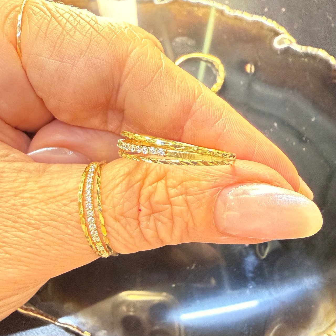 Anel 3 Aros, 2 diamantados, e 1 cravejados de Zircônias, 1,4gr., no ouro amarelo 18K. Lindo modelo atemporal, combinado a sofisticação do trabalho diamantado com o brilho das pedras.