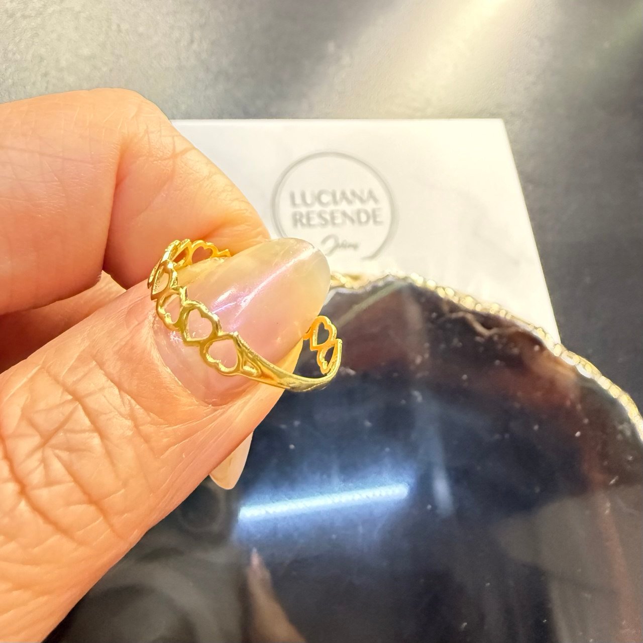 Anel de corações vazados, no ouro amarelo 18K. Os corações têm como símbolo o sentimento de amor, afeto, gratidão ou amizade, eternizado em uma joia