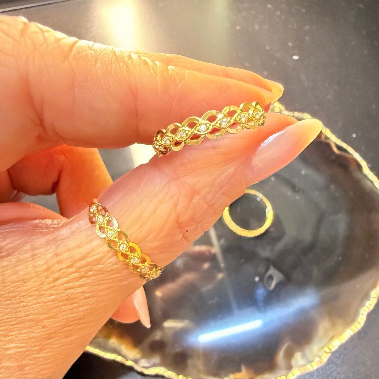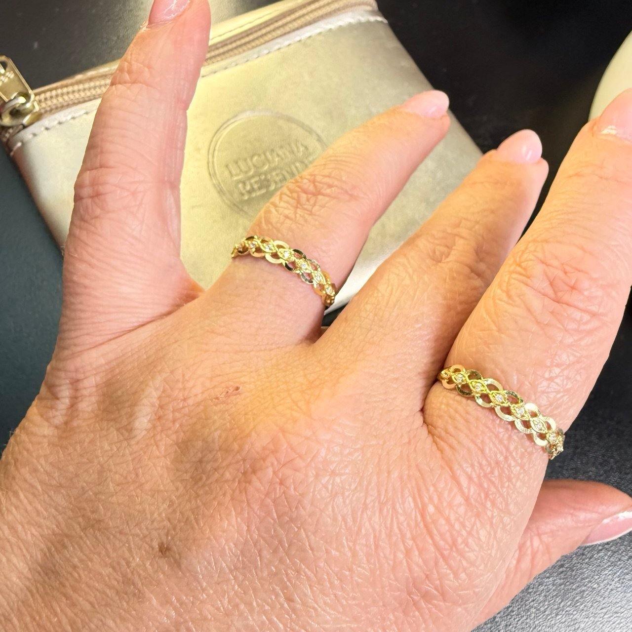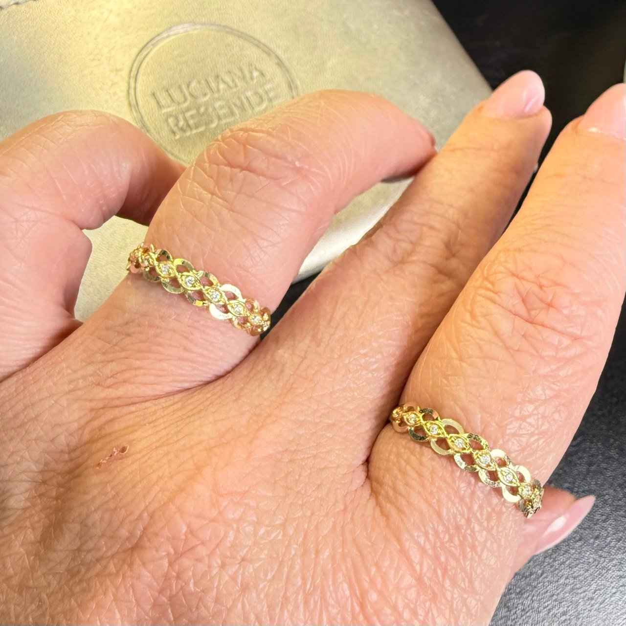 Anel Elos diamantados e cravejados de Zircônias, 1,1gr., no ouro amarelo 18K. Moderno e belíssimo, esse anel combina um desing mais moderno com o brilho das pedras.