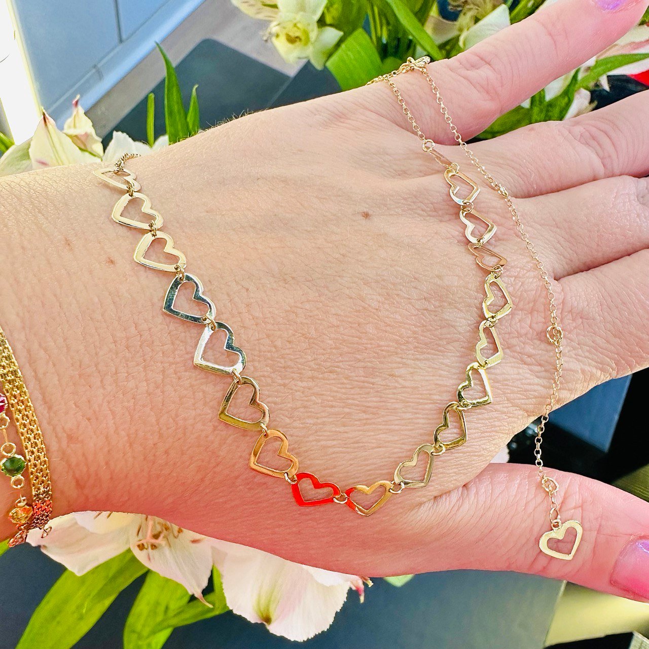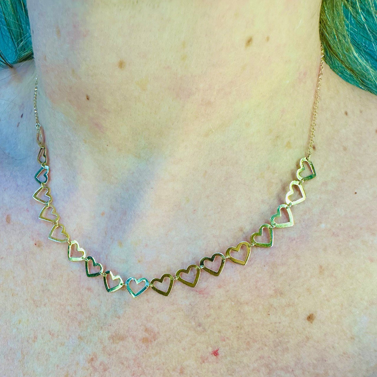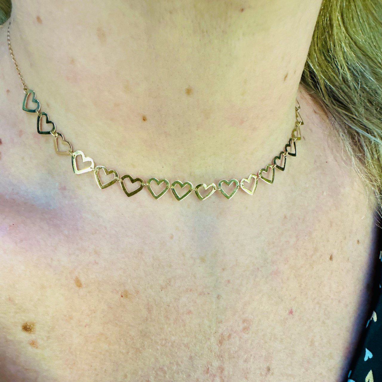 Gargantilha/Chocker Corações Vazados, com 45cm, 2,5gr, 4 elos redutores adicionais, no ouro amarelo 18k.
