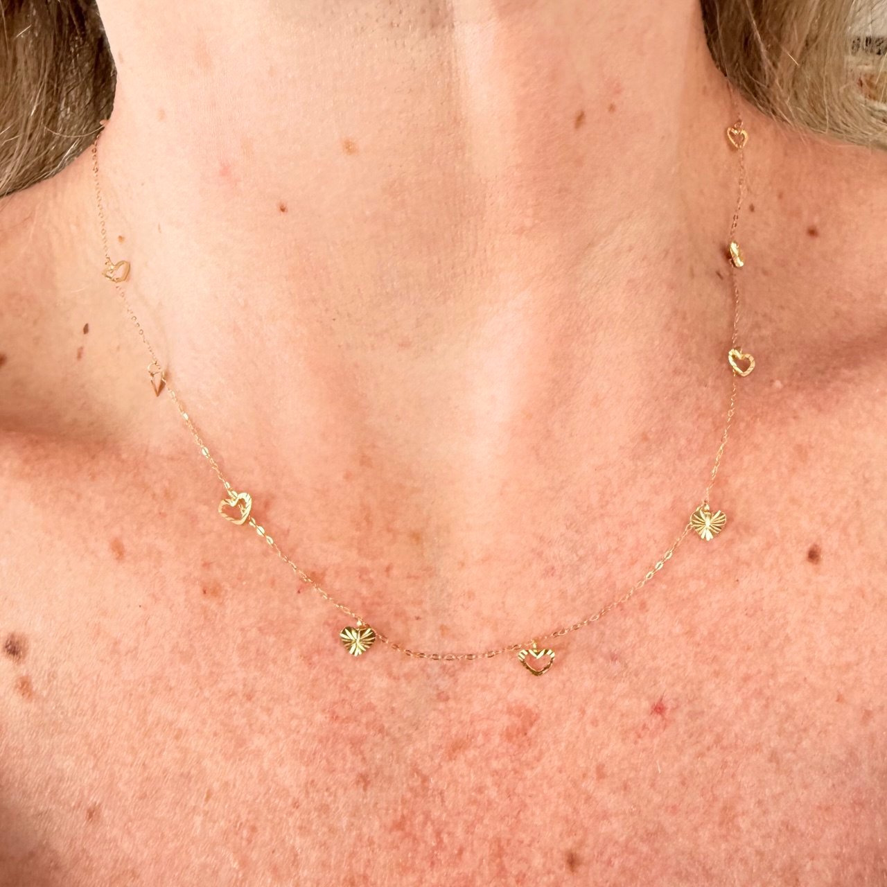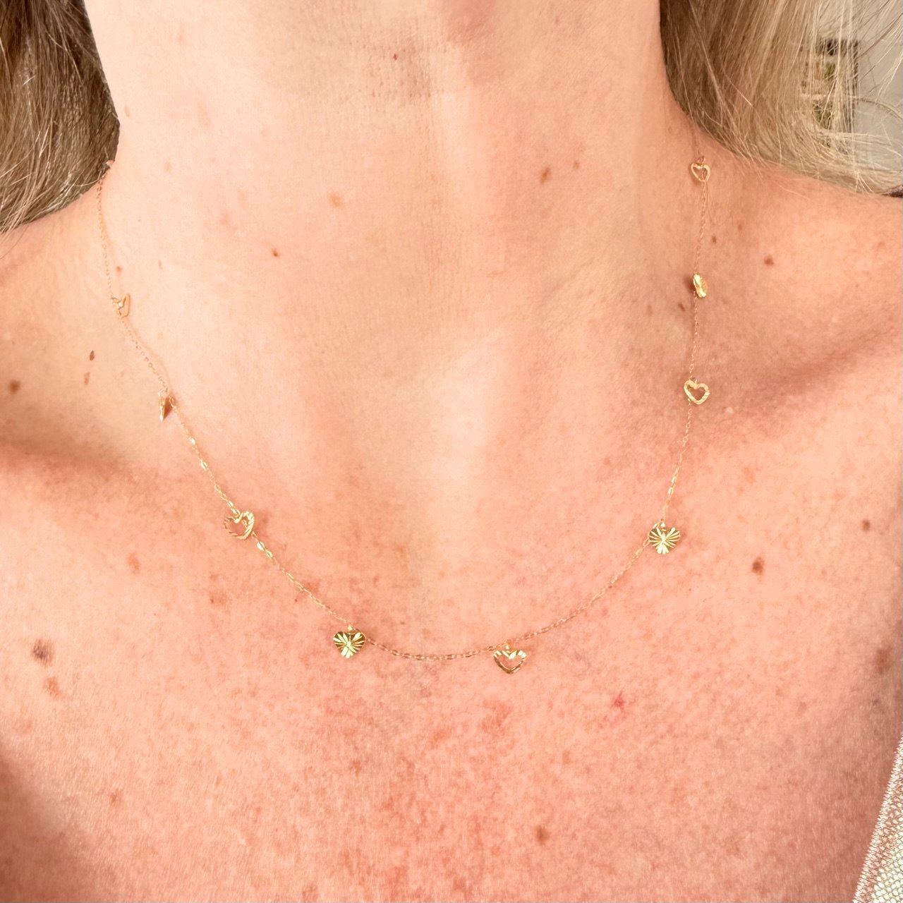 Gargantilha Corações diamantados, inteiros e vazados, 45cm, elo adicional 40, no ouro amarelo 18 K. Modelo lindo, moderno, divertido, que traz sofisticação aos seus looks do dia a dia!
