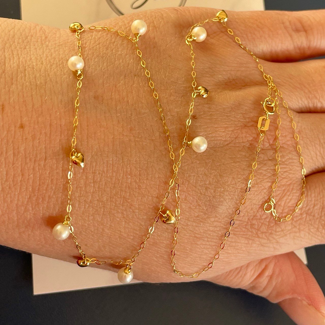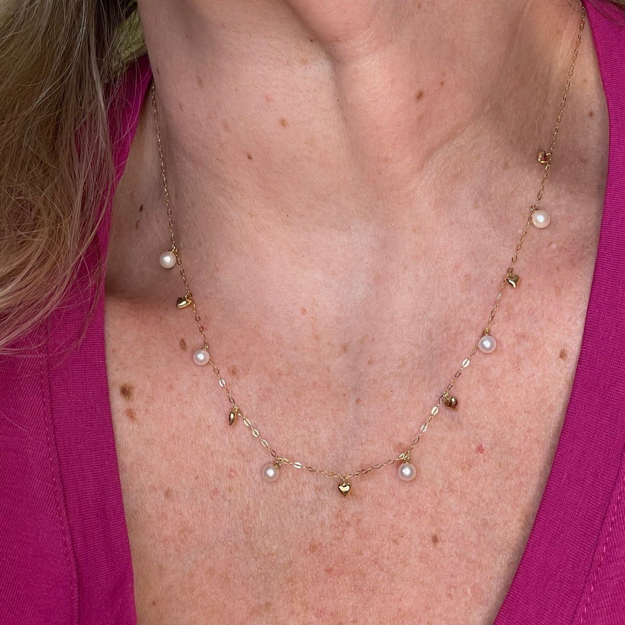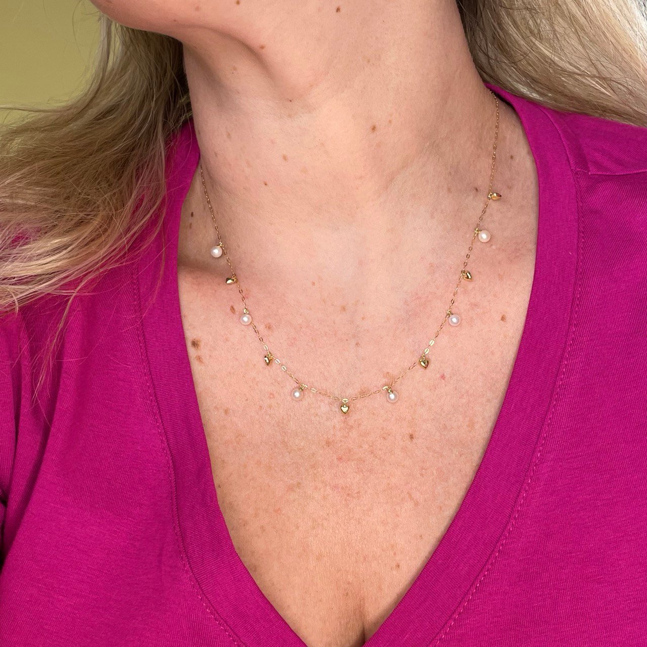 Gargantilha de Pérolas e Corações 45cm, com Elo Redutor no 40 no Ouro Amarelo 18K