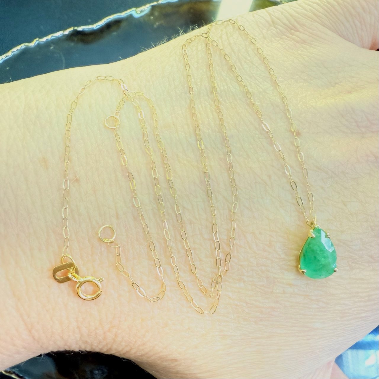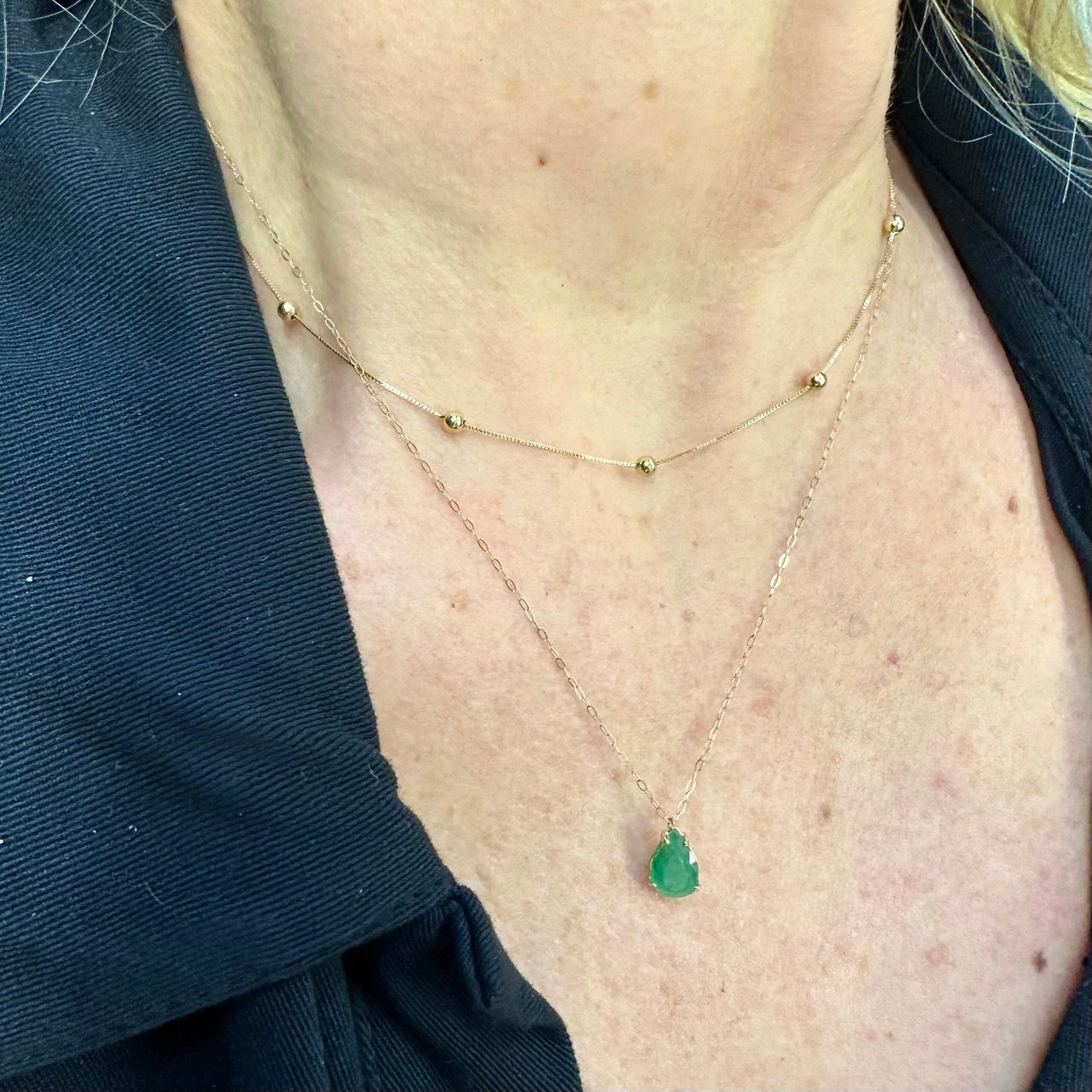 Gargantilha Esmeralda natural gota 10x 6,4mm, 1,75ct, corrente 45cm com elo redutor, no ouro amarelo 18K.