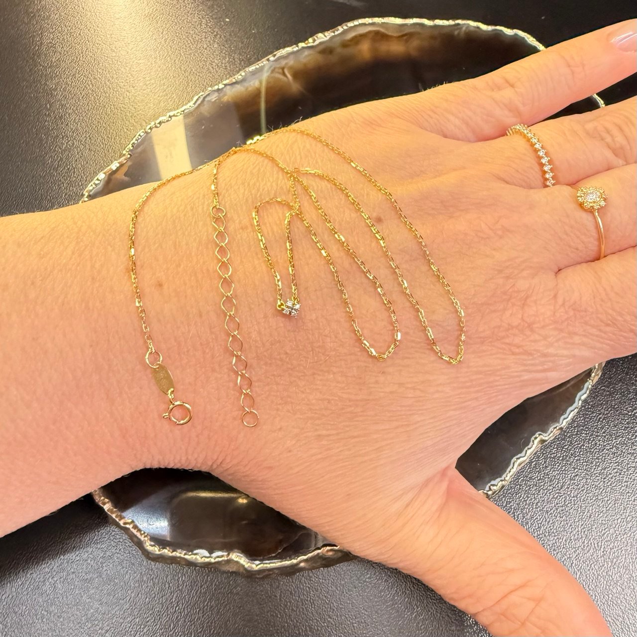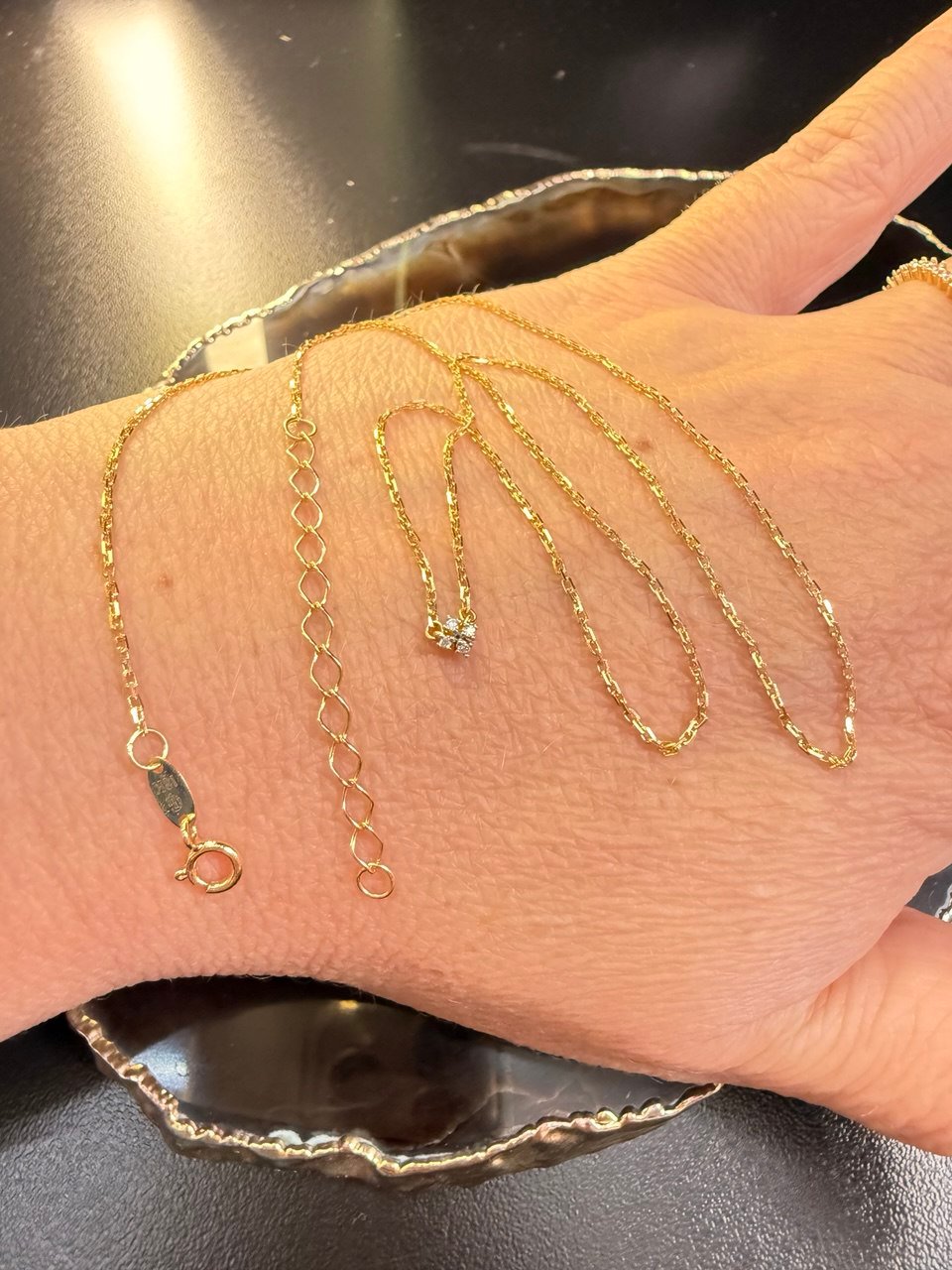 Gargantilha Ponto de Diamantes, pavê formato quadrado, 4 diamantes de 0,4pts, malha cartier 46cm total, 4cm de elos para ajuste, no ouro amarelo 18K