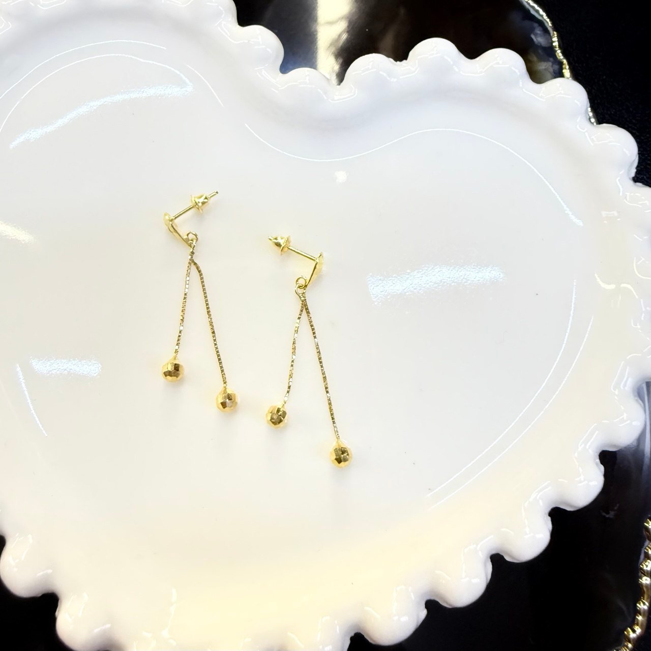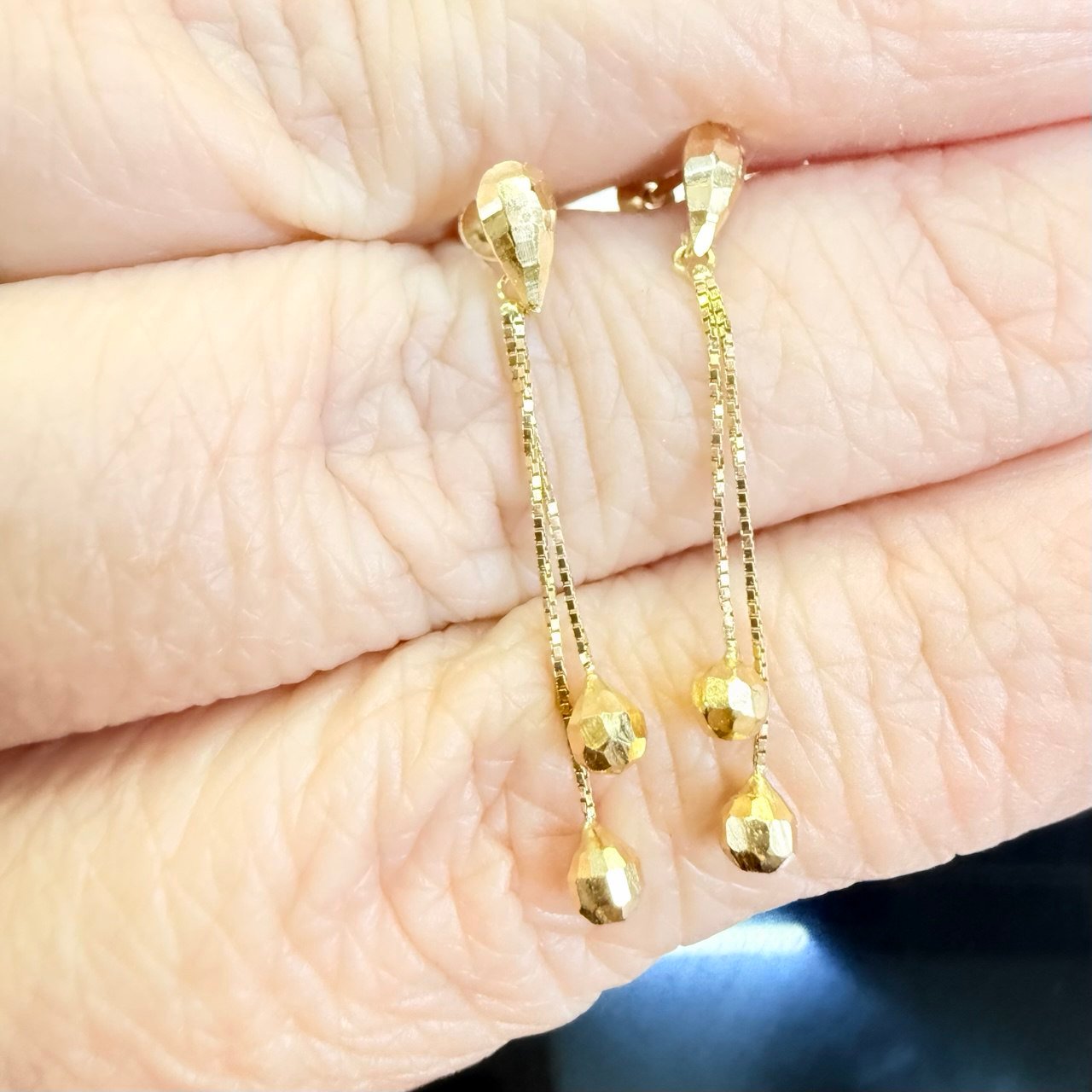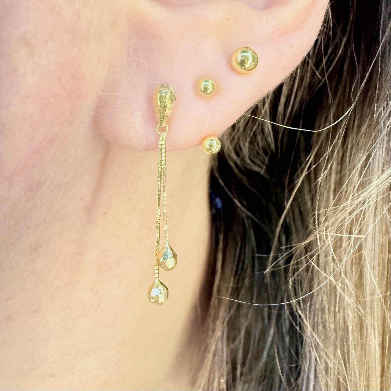 Par de Brincos Gota Fios e Bolas no Ouro 18K